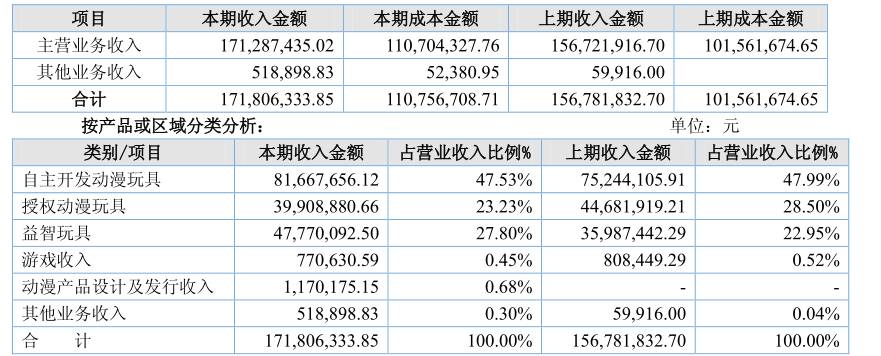 据报告披露,公司营业收入比上期增加16.6%,金额为6,791,111.45元。因IP影响力提升,公司版权内容在年内快速增长,成为主要收入来源之一。公司也加大了衍生品投入,其营收占比略微上涨。