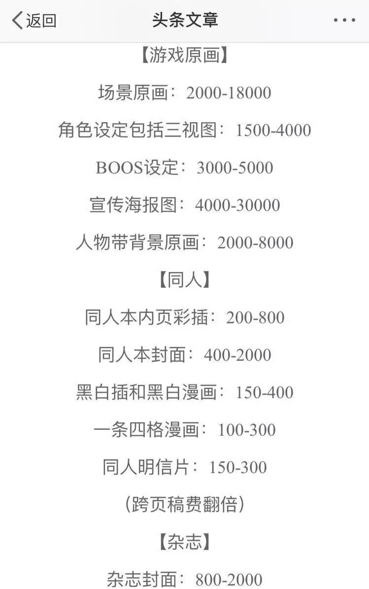 另外,同人稿费还比商业稿费要低得多。前段时间微博上流传着一篇《【画手防骗指南】稿费价格区间表,满满的干货》的文章,阅读量超过160万,文中同人的价格根据封面、内页彩插、黑白漫画等不同,价格在100至2000元之间浮动。虽然这篇干货被普遍吐槽价格太低,但哪怕把文中划分的同人价格翻倍,比起商稿仍然非常廉价。