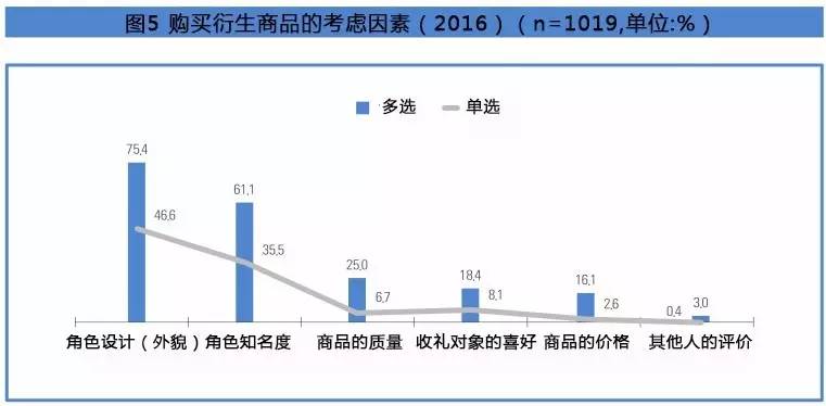 通过对有购买经历用户的调查,在购买衍生商品时,考虑“卡通角色设计(外貌)”的用户所占比例最高为75.4%,其次考虑的因素分别是“卡通角色知名度”(61.1%)、“商品的质量”(25.0%)等。