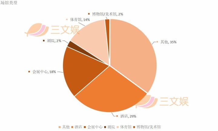 就举办场馆来看,酒店和会展中心合计占比接近一半,体育馆也占到了14%,场馆都相对比较“正规”。而演唱会、见面会等,有不少会选择在剧场。