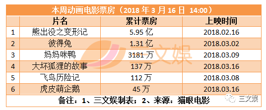 国内动画电影《妈妈咪鸭》,自上映以来一直保持高分高评价的节奏,票房也在大幅度上升。法国动画电影《飞鸟历险记》票房最近没有什么长进,今日新上映两部法国动漫电影《大坏狐狸的故事》和《虎皮萌企鹅》,首日上映,票房表现还算不错。