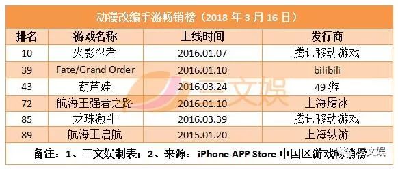 动漫改编手游畅销榜方面,《火影忍者》进入总榜单榜单前十,目前排名第十名。《Fate/Grand Orde》、《葫芦娃》排名依旧很稳定,《龙珠激斗》、《航海王》系列依旧保持在总榜单前100。