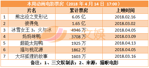 动画电影票房方面,由中、美、俄三国合拍动画喜剧电影《超能太阳鸭》在4月13号上映,此次是该片自2016年首映后的重新上映。这是一部关于爱与勇气的故事,废柴鸭为拯救族群华丽变身,上映当天票房破千万。另一方面,人气爆棚的《冰雪女王3》票房再次翻番,同一天上映的《猫与桃花源》显得力不从心,国产动画的诟病接二连三地暴露出来。而年初上映的《熊出没之变形记》票房仍在小幅上涨,这也是国人的骄傲和动漫界的榜样。