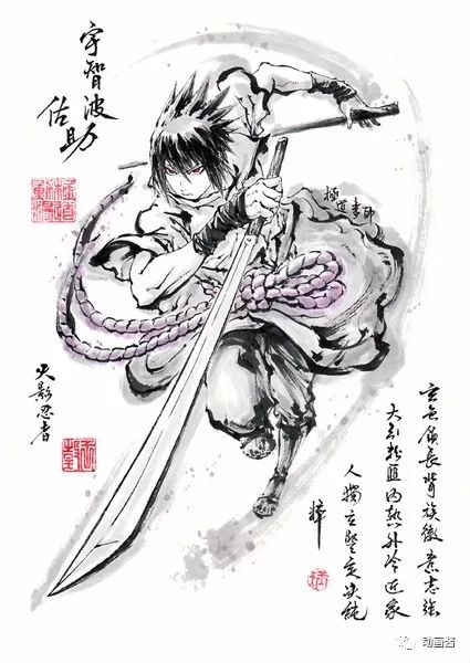 他画中的二次元人物都带着水墨画的泼墨意境,他的画作线条看似简单,却独具美感。他笔下的男性勾勒都极具张力,女性却画风细腻。