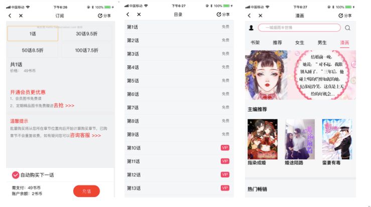 虽然,用户从打开美图秀秀到进入“漫画”的界面最快需要四步操作,但是美图公司对于线上漫画的运营更倾向于类似漫画平台的运营模式。如,打赏和“VIP订购”。VIP用户有三个特权:1、专区图书免费畅读;2、定期精品图书免费赠送;3、VIP看书折上折。具体到金额,VIP会员25元/月,38元/季度;49元/半年;58元/年。也就是说,会员时间越长,折扣越大,按季度付款打5折,半年付打4折,年付低至2折。