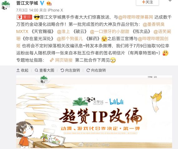 7 月 3 日,晋江文学城官方微博宣布,已与 B 站达成数千万签约金动漫化战略合作。第一批完成签约的作品包括《天官赐福》《破云》《残次品》《你在星光深处》《解药》。