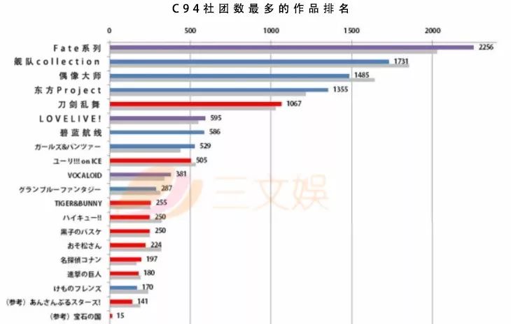 IP方面,Fate系列同人社团/个人数量继续占据首位,《舰队Collection》《偶像大师》《东方Project》随后。中国游戏《碧蓝航线》首次上榜,排名第七。