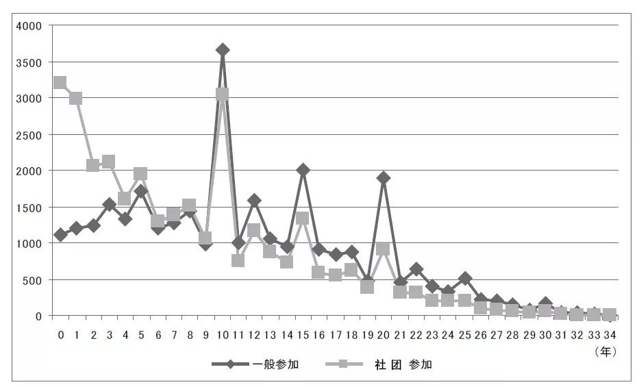 其实,一份2011年《COMIC MAKET35周年调查报告》已经显示,无论是一般参加者还是参展社团,有着10年参加经历的人占大部分。尽管社团参展年数随着时长总体呈下降趋势,但在15年和20年处又出现两次小高峰。可见,日本的同人爱好者对于所爱事物的毅力非常强大。如今,距调查又有7年过去了,Comiket的“高龄化”趋势,或许已经愈发明显。