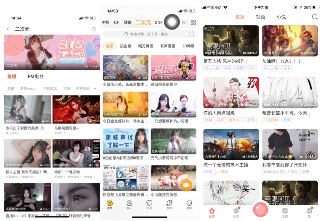 二次元直播(从左至右:斗鱼、虎牙、Kilakila)