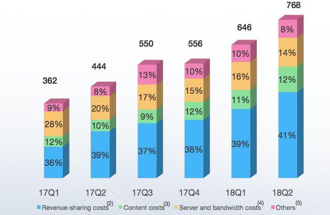 B站第二季度营收成本为7.759亿元(约合1.173亿美元),同比增长74%;其中分成成本为4.174亿元(约合6310万美元),同比增长84%;内容成本占营收成本的12%。