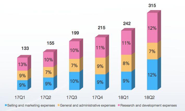 B站第二季度总运营支出为3.576亿元(约合5400万美元),同比增长88%;其中销售与营销支出为1.278亿元(约合1930万美元),同比增长146%;总务和行政支出为9790万元(约合1480万美元),同比增长30%;研发支出为1.319亿元(约合1990万美元),同比增长108%。