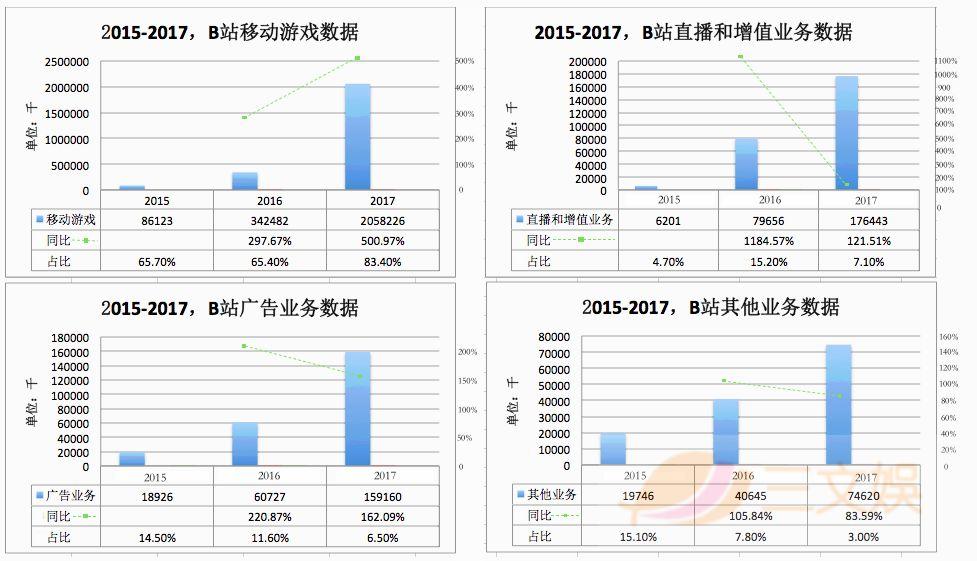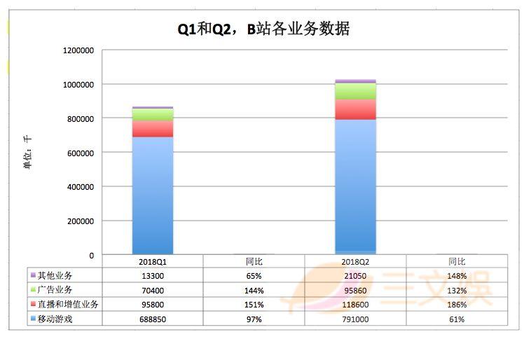 B站游戏业务在第二季度收入为7.9亿元人民币,同比增长61%;广告业务收入达9586万元,同比增长132% ;直播和增值服务业务收入达1.2亿,同比增长186%。