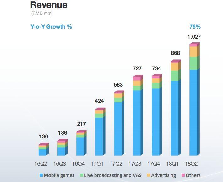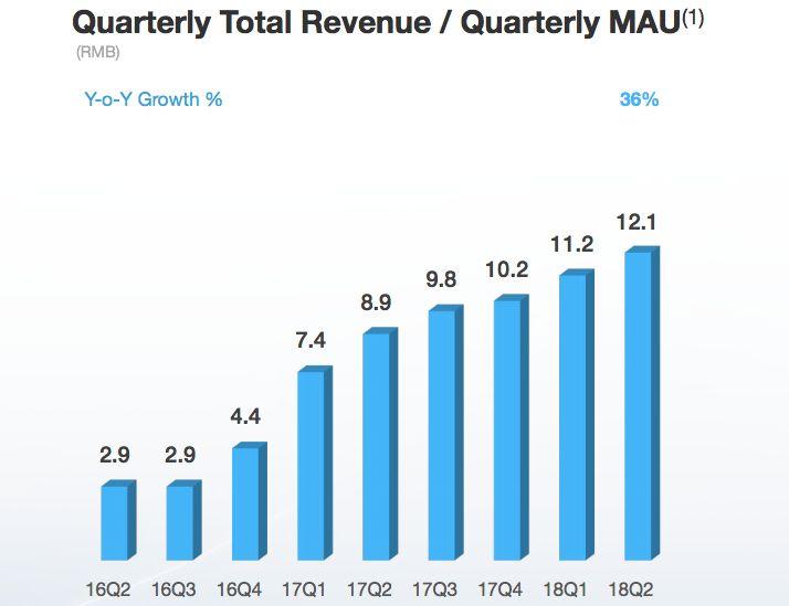 B站MPU/MAU的比例从2017年的1.5%增长到2018年Q1的3.2%和Q2的3.5%,付费用户比例增大,不过月度ARPPU有所下降,从2017年的185元下降到2018年Q1的106元和Q2的102元。