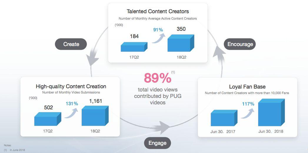 B站第二季度月均活跃UP主数量及其上传的视频数量分别同比增长91%和131%,拥有一万以上粉丝的UP主数量同比增长117%。