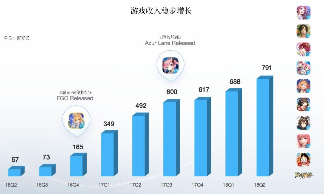 这部分增长主要得益于两款独家代理游戏《命运-冠位指定》(Fate/Grand Order,以下简称FGO)和《碧蓝航线》的强劲表现。B站已经与FGO的日本版权方Aniplex完成了续约。FGO首月玩家达到450万人,曾登顶App Store中国区收入榜;《碧蓝航线》首月玩家达600万人,首月收入即过亿元。
