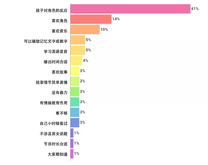 总体看来,对于幼儿来说,家长更看重的是动画内容的理解难度低,孩子通过观看动画可以获得乐趣。动画作品中的角色形象能够引起幼儿的注意力,是父母决定愿意给孩子观看该动画的重要因素。同时,由于幼儿观众缺乏判断能力,父母自身对于一部作品的喜好态度以及是否具有教育作用也多少左右了选择,但比例都很低。