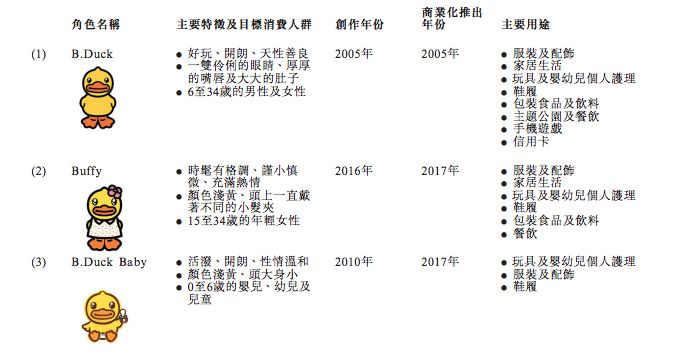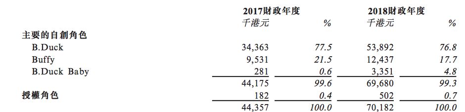 德盈国际的收入也主要来自小黄鸭家族。2018年度,德盈国际通过自创的小黄鸭角色(B.Duck)获得的收益从2017年的3436.3万港元增长到5389.2万港元;小黄鸭妹妹(Buffy)的收益从2017年的953.1万港元增长到2018年的1243.7万港元,小小黄鸭(B.Duck Baby)的收益从28.1万港元增长到335.1万港元。