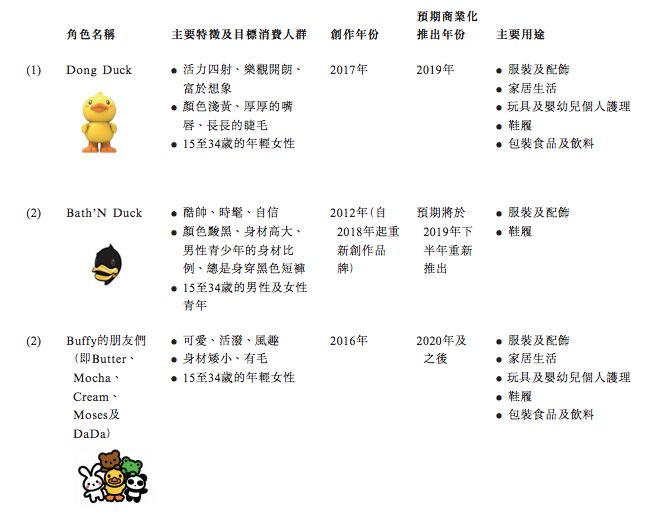 德盈国际2017年推出了面向女性的Buffy和面向婴童市场的小黄鸭Baby,预计在2020年推出的其他储备新角色还有Buffy的朋友们(Butter、Mocha、Cream、Mose及DaDa)。