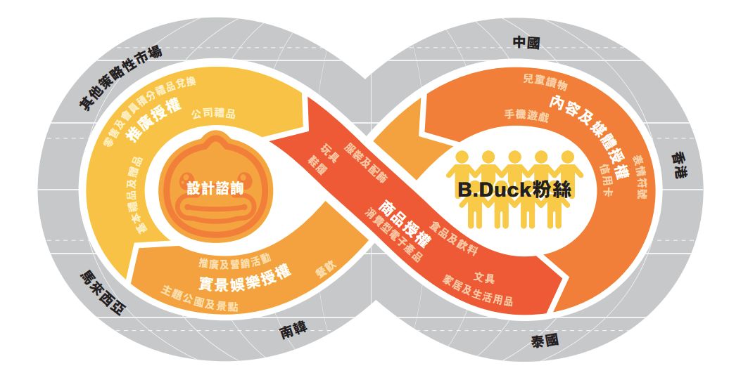 基于小黄鸭,德盈国际发展出五项业务:设计咨询、商品授权、推广授权、实景娱乐授权以及内容及媒体授权。