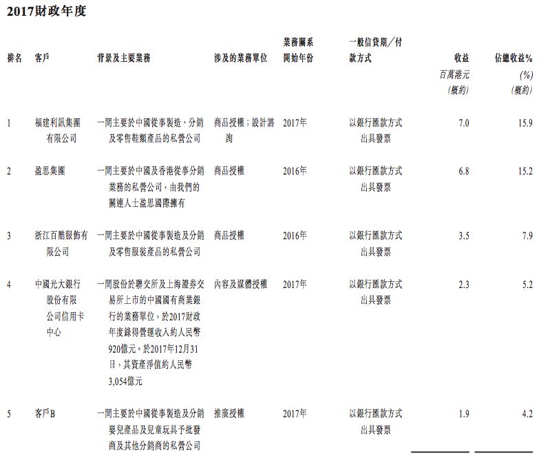 德盈国际的180个授权客户,涵盖多个消费板块,包括批发商、零售商、推广代理商、 实景娱乐运营商、银行及其他。