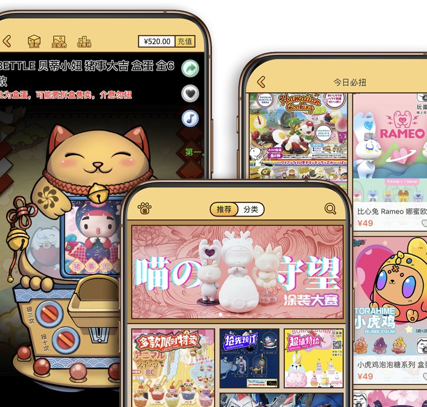 52TOYS的线上扭蛋平台“玩蛋趣”于2017年上线,拥有独立APP、微信小程序、H5页面三个入口,拥有上万SKU。除了线上盒蛋扭蛋的销售,玩法也在不断更新,引入了“分享砍价”、“一番赏”、“抽奖福袋”等模式。