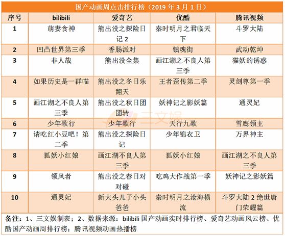国产动画方面,根据B站动画实时排行榜,截止3月1日,本周榜单变化幅度不大。改编自紫伊281所著同名网络小说的作品《萌妻食神》排名第一,综合得分为58万分。唯一一部新晋榜单的作品《通灵妃》是根据肉肉创作的同名漫画改编而来,本周排名第十,综合得分为15万分。