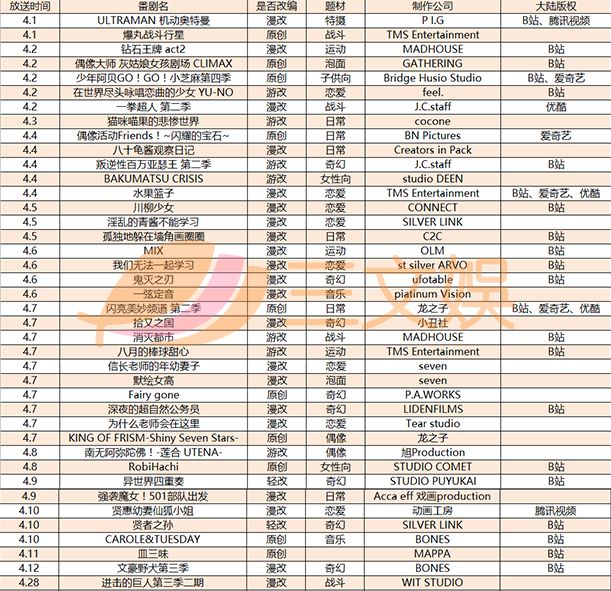 据不完全统计,截止到3月29日,已确定上线的4月新番动画有40部,国内版权方引进了其中的25部,与上季度的30部相比相对持平。具体到平台来看,B站依旧保持着新番引进的榜首位,在新番版权竞争中拿下了17部独播动画和5部合播动画;优酷获得了《一拳超人第二季》的独播权和两部新番的合播权;爱奇艺获得了《偶像活动Friends!~闪耀的宝石~》的独播权和三部新番动画的合播权;腾讯视频获得了《贤惠幼妻仙狐小姐》的独播权和两部新番动画的合播权。