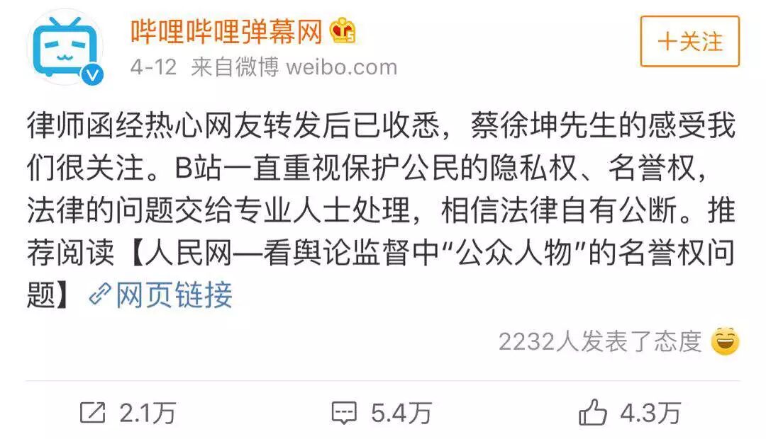 2. 蔡徐坤工作室给B站寄律师函