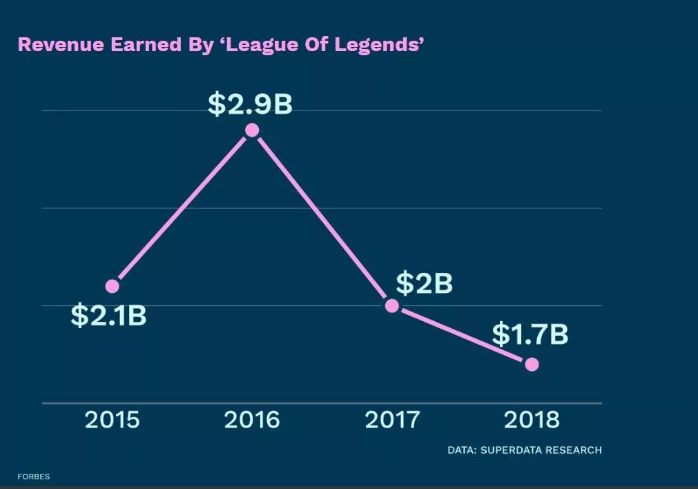 刚刚过完10岁生日的《英雄联盟》也面临着这个问题,虽然在成功电竞化以后,《英雄联盟》一直维持着不错的媒体曝光度,但这款游戏在盈利了能力上已经迎来了衰退。2018年,英雄联盟年度收入17亿美元,和2016年的29亿美元比起来差了不少。