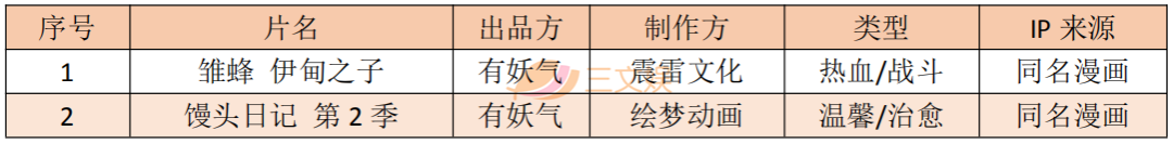 优酷最近并未针对动画项目开启新一轮推介会,因此已知项目较少。目前仅燃MAX剧场尚未播出的两部漫改动画《雏蜂 伊甸之子》和《馒头日记 第2季》,其中《雏蜂 伊甸之子》于近日制作完成,将于11月中旬正式上线。这两部作品虽然IP均来自于有妖气,但风格截然不同,《雏蜂 伊甸之子》是正统热血少年作品,而《馒头日记 第2季》内容温情治愈。