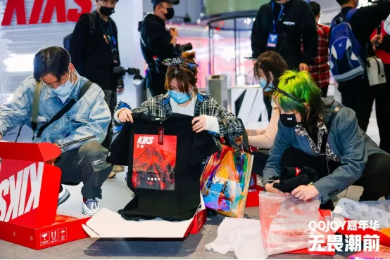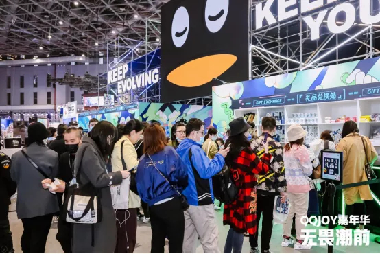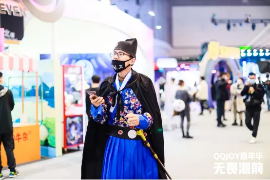 在本次QQJOY现场,也有许多脚踩滑板、COS动漫人物、身穿汉服逛展的年轻人,他们在这里蹲守限量球鞋首发开售、抢潮玩新款联名款、玩巨型扭蛋机,不同圈层的用户都能在沉浸式的情绪感染环境中获得文化认同感。