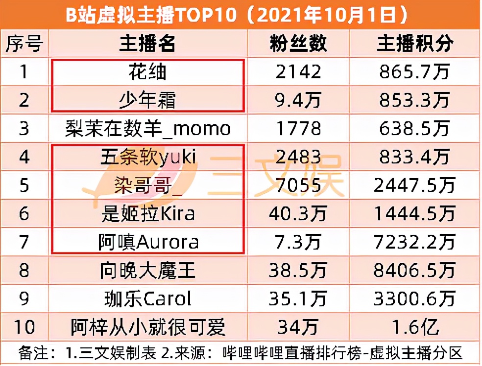 哔哩哔哩虚拟主播直播排行周榜方面,新晋入榜的 “花䌷”登顶榜首,这是一位新人VUP,主要直播杂谈、唱歌等内容,是PlanZ企划边缘的自由个人势。截至10月1日,在B站有2142位粉丝,主播积分累计865.7万分。
