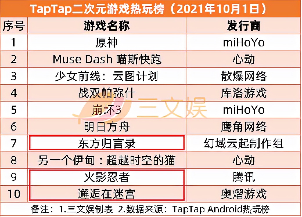 TapTap二次元游戏热玩榜方面,miHoYo的《原神》重归榜首,截至10月1日,在TapTap上累计1947.9万次下载量、1001.1万关注数,评分8.1分。
