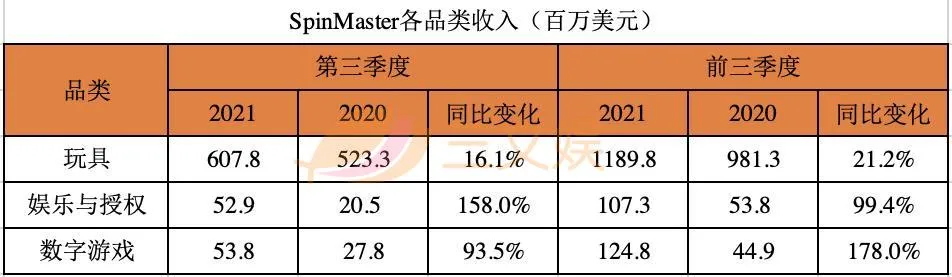 本季度,SpinMaster营收7.15亿美元,同比增长25%,调整后EBITDA为2.17亿美元,相比去年上行55.3%。该公司营收来自玩具、娱乐与授权、数字游戏三个部门。