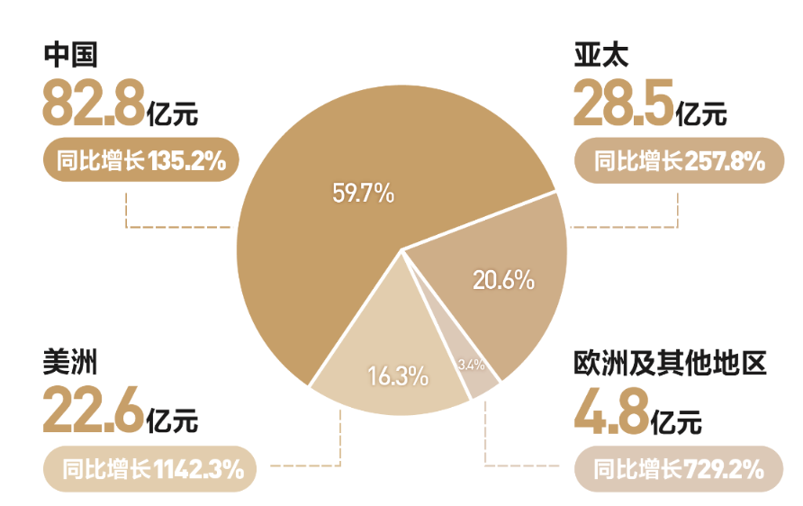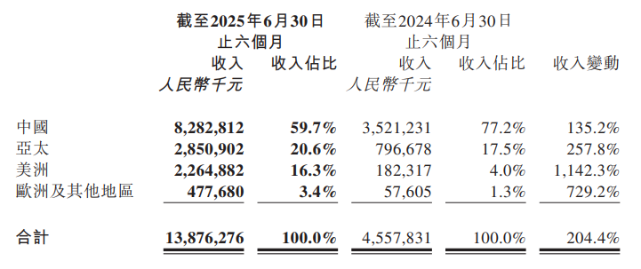 2025上半年,泡泡玛特在中国市场的收入约82.83亿元,同比增长135.2%;亚太地区收入约28.51亿,同比增长257.8%;美洲市场收入约22.65亿元,同比增长1142.3%;欧洲及其他地区收入约4.78亿元,同比增长729.2%。