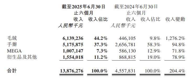 上半年泡泡玛特的毛绒产品收入约61.39亿元,占比从去年同期的9.8%跃升至44.2%,成为第一大品类;手办、MEGA、衍生品及其他的收入分别约51.76亿、10.07亿、15.54亿元。