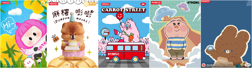 据透露,名创优品已经签约9位潮玩艺术家,在社媒平台已经亮相的IP就有Carrot Street 萝卜街、麻糬嘭嘭、小熊 KUMARU、猪坚强等等。今年内的签约数量预计还会实现显著突破,未来更将保持稳定且快速的增长节奏。