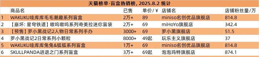 对于潮玩和谷子的用户与从业者,名创优品是无法忽视的存在。文创潮周汇栏目统计显示,名创优品长期位于天猫盲盒热销榜前列,最近1个月内就有其店内WAKUKU毛毛潮趣系列登上榜首,力压泡泡玛特等品牌,而独家的右右酱萌趣歪头系列icon box手办也进入热销榜前列。