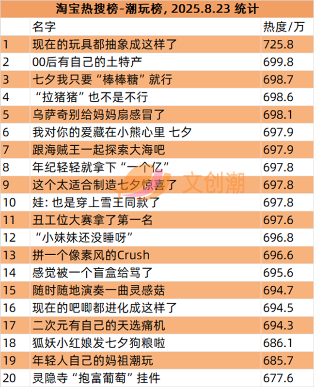 淘宝热搜潮玩榜,每日实时更新,文创潮8月23日统计到的前五名分别是:现在的玩具都抽象成这样了、00后有自己的土特产、七夕我只要“棒棒糖”就行、“拉猪猪”也不是不行、乌萨奇别给妈妈扇感冒了。