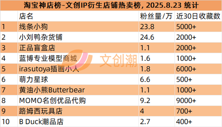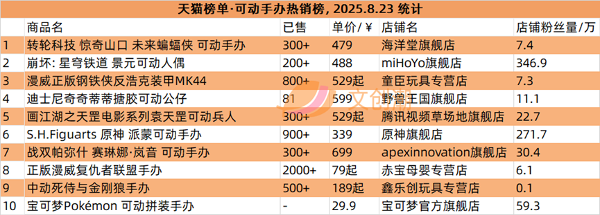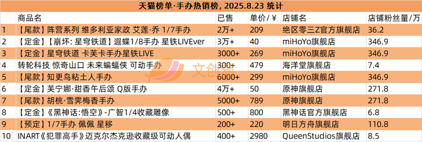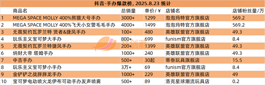 抖音平台榜单实时更新,文创潮8月23日统计到的盲盒、手办、卡牌三大品类的爆款前十名,如图所示。