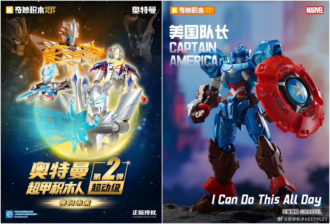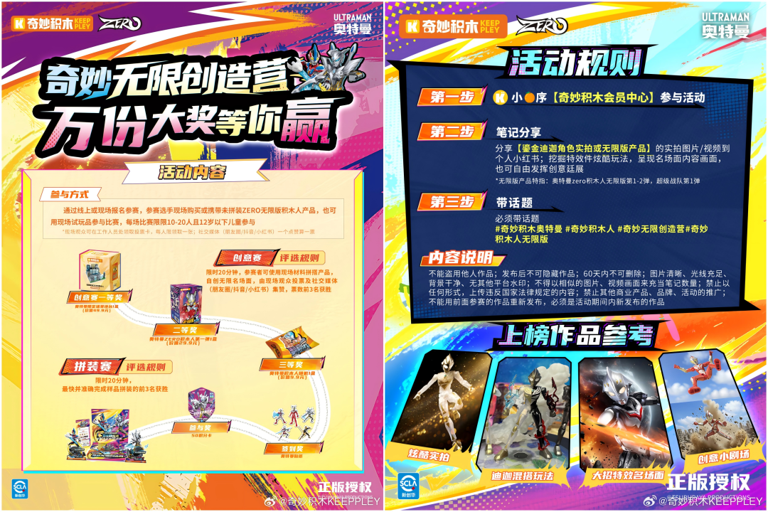 其中奇妙积木KEEPPLEY不仅推出了奥特曼、漫威等IP的积木人,还开启了面向积木人玩家的创作征集和全国巡回拼搭赛事(类似布鲁可的BFC)。