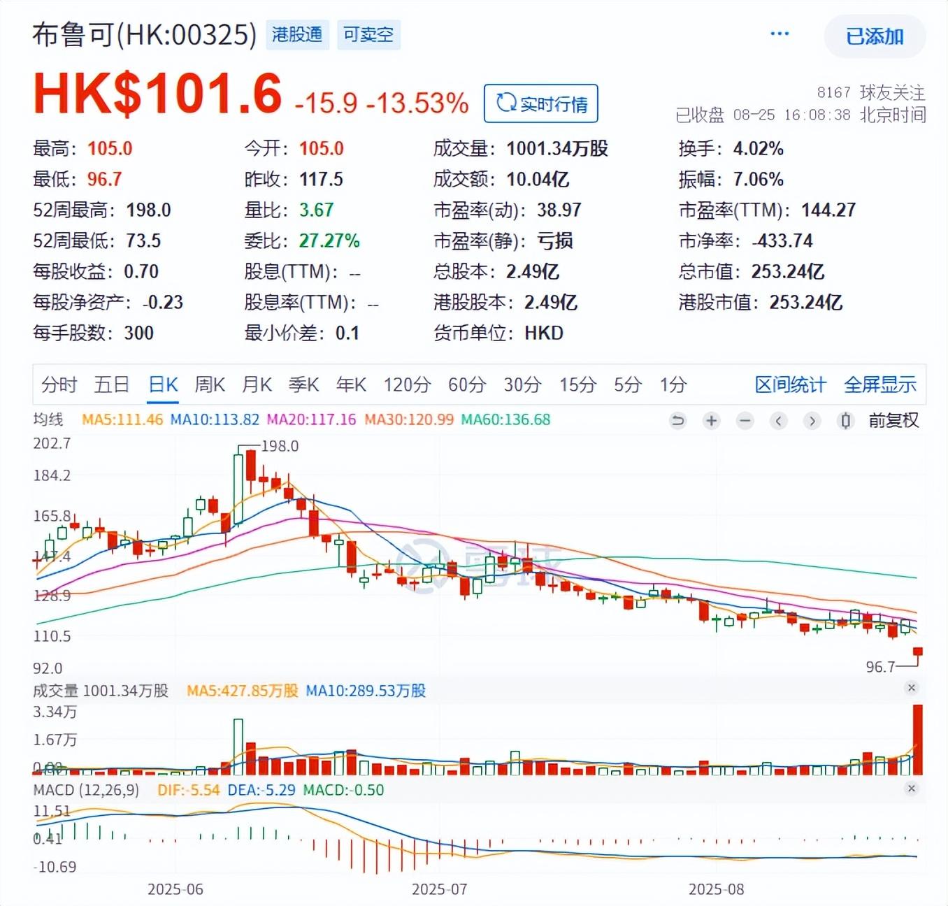 6月9日,布鲁可调入港股通交易名单,次日股价达到198港元。截止今日(8月25日)收盘的价格为101.6港元,跌去接近一半。