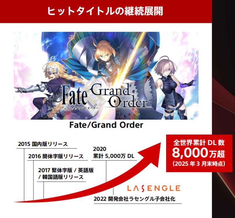 Aniplex的一大收益来源是知名手游《Fate/Grand Order》,截至3月全球累计下载量突破8000万。