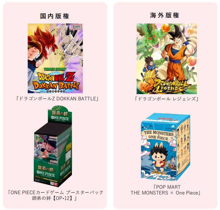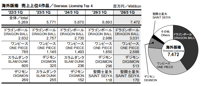 版权(授权和商品化)方面,在日本国内,《龙珠》系列的手游《七龙珠 激战传说》收入未达去年同期,但以《龙珠大魔》为主的商品化版权收入顺利增长,如手办、一番赏等。