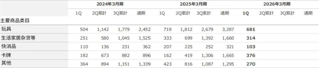 玩具收入12.89亿日元,同比下降7.4%;生活家具杂货等收入5.82亿日元,同比下降28.41%;快消品收入1.72亿日元,同比下降49.11%;卡牌收入7.35亿日元,同比大幅增长317.61%。