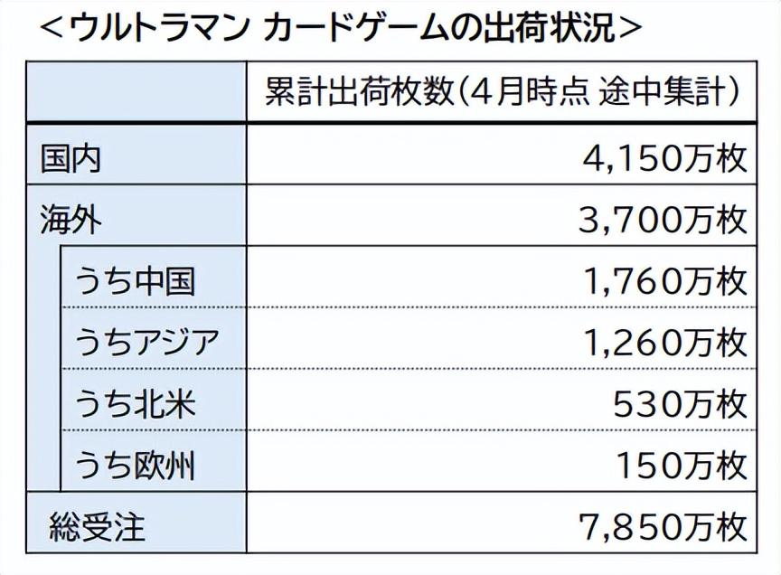 2024年10月在全球15个国家和地区同步发售的4语言版本奥特曼新卡牌“ULTRAMAN CARD GAME”,截至今年4月累计出货量达7850万张,日本国内4150万张,海外3700万张,海外占比最大的是中国,仅中国便销售了1760万张。