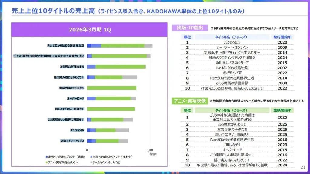 2季度播出了《被大猩猩之神加护的小姐在皇家骑士团受到爱戴》《直至魔女消逝》《每日男公关》《随兴旅-That’s Journey-》等多部角川原作IP改编的动画作品,但未出现《【我推的孩子】》这类大热门佳作,因而收入同比大幅下滑。