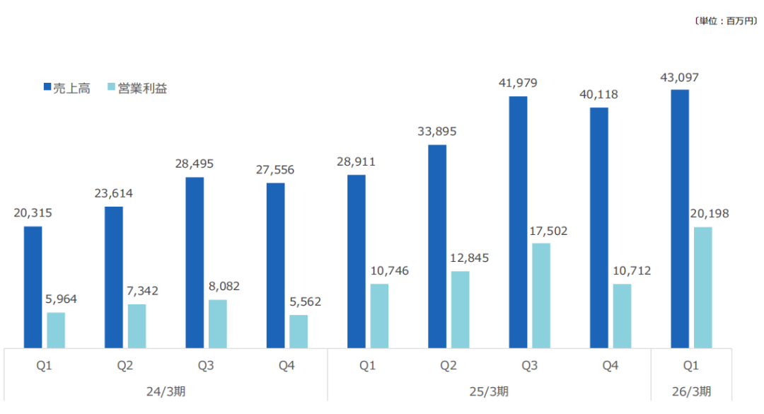 其中,2季度单季销售额和营业利润均创历史新高,分别为430.97亿日元(同比增长49.1%)和201.98亿日元(同比增长88%)。