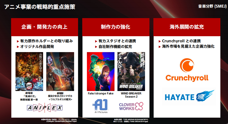 索尼音乐娱乐的动画事业战略重点,是以Aniplex为中心增强企划开发能力,积极与实力动画工作室达成合作,扩充自身制作能力,并且借助索尼旗下的流媒体平台Crunchyroll走向海外,放眼全球提升IP企划能力,打造更多优质IP。同时,通过企业内的协作,从音乐、动漫、游戏、活动、商品、粉运等多方面实现IP价值最大化。