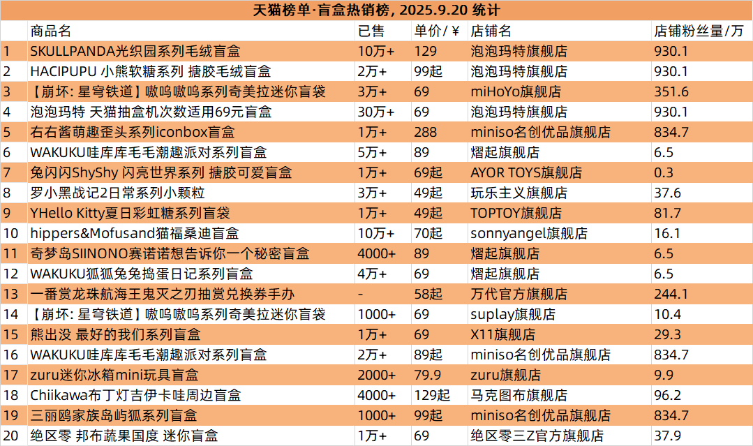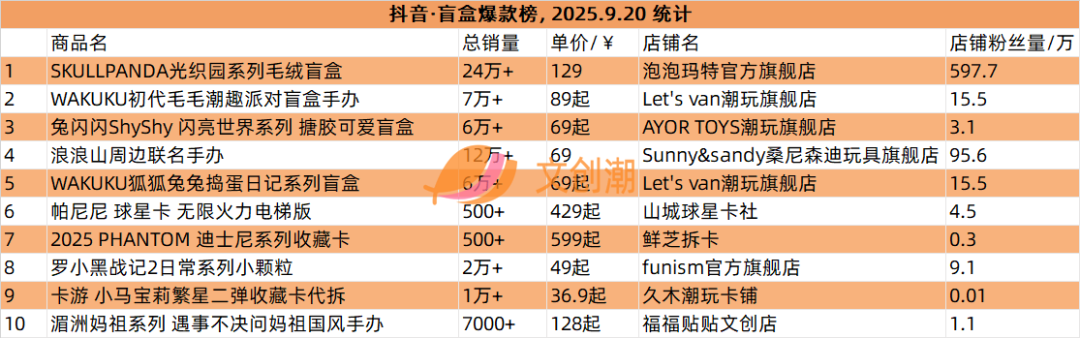 抖音平台榜单实时更新,文创潮9月20日统计到的盲盒、手办、卡牌三大品类的爆款前十名,如图所示。盲盒爆款榜首是SKULLPANDA光织园系列毛绒盲盒。